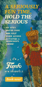Just a 3 hour drive from Houston, Camp Fimfo New Braunfels is great for a weekend getaway or extended vacation. You'll find us right on the horseshoe bend of the Guadalupe River, a popular destination for river tubing and fly fishing. Explore our property and all its attractions, like our water park with four large water slides and interactive playground, pools, hot tubs, a swim-up bar, private cabanas, mini-golf, river access, and more!